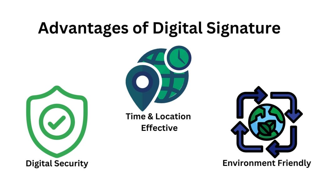 - Environment Friendly: In Digital Signature procedure there is no paper involved. The entire process is paper-less. In which no tree cutting or any harm is done to the environment. It saves countless trees from getting destroyed and is actually benefiting the human race in restoring the vegetation.